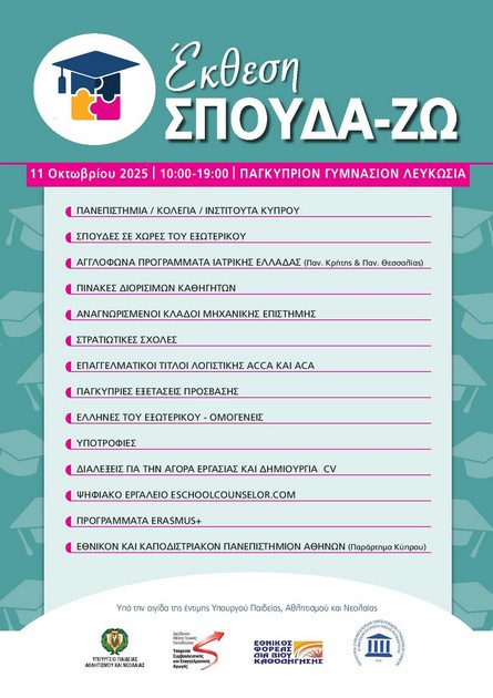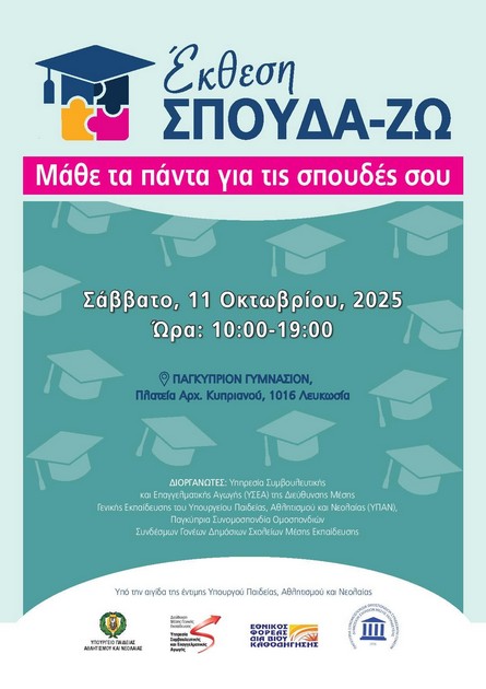 Η Υπηρεσία Συμβουλευτικής και Επαγγελματικής Αγωγής (ΥΣΕΑ) σε συνεργασία με την Παγκύπρια Συνομοσπονδία Ομοσπονδιών Συνδέσμων Γονέων Δημοσίων Σχολείων Μέσης Εκπαίδευσης διοργανώνει την Έκθεση «ΣΠΟΥΔΑ-ΖΩ 2025».