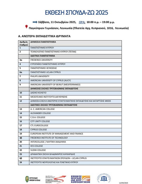 ΕΚΘΕΣΗ ΣΠΟΥΔΑ-ΖΩ 2025 ️ Σάββατο 11 Οκτωβρίου 2025 Παγκύπριο Γυμνάσιο Λευκωσία ⏰10.00π.μ. - 19.00μ.μ. Αφορά Μαθητές/τριες -Φοιτητές/τριες -Γονείς Πανεπιστήμια - Κολλέγια Σπουδές στο εξωτερικό Υποτροφίες Αγγλόφωνα πρόγραμματα Ιατρικής Επισυνάπτονται οι πληροφορίες και το πρόγραμμα παρουσιάσεων της Δράσης.